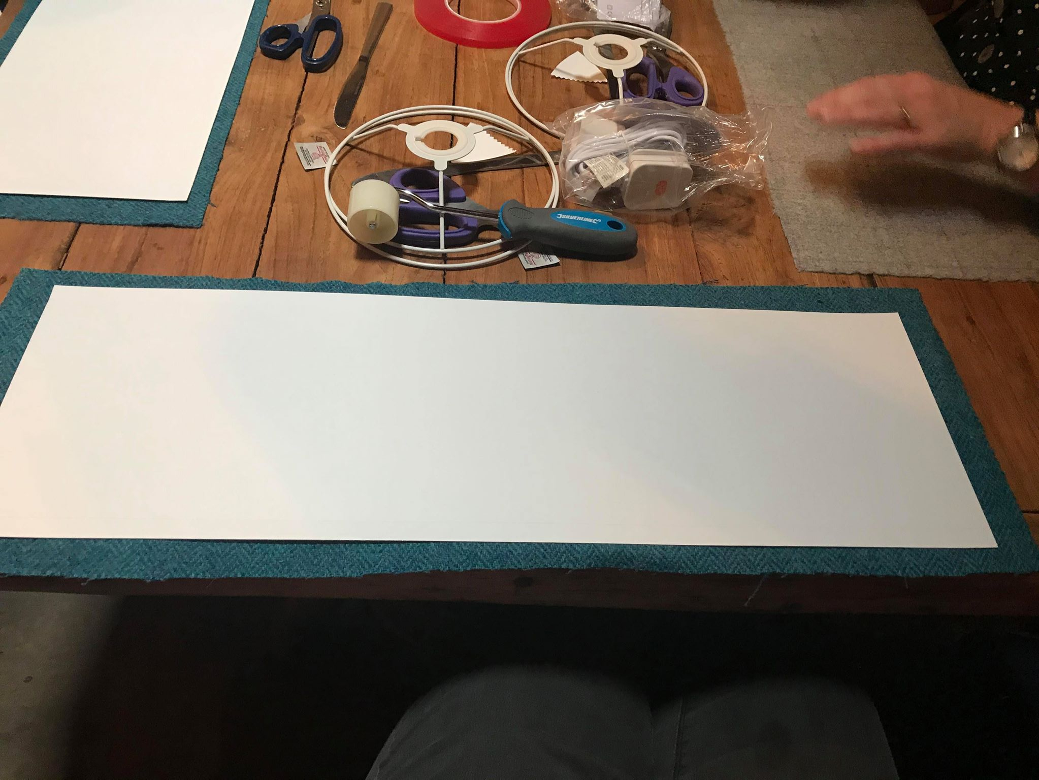 First up we measured our material and stuck it to the lampshade. We cut a long the bottom of the plastic taking a small amount off. We then cut one side right up to the edge of the plastic and then on the other side we cut just a little bit and left some at the side so we could create a fold. We used the iron to create a crease.