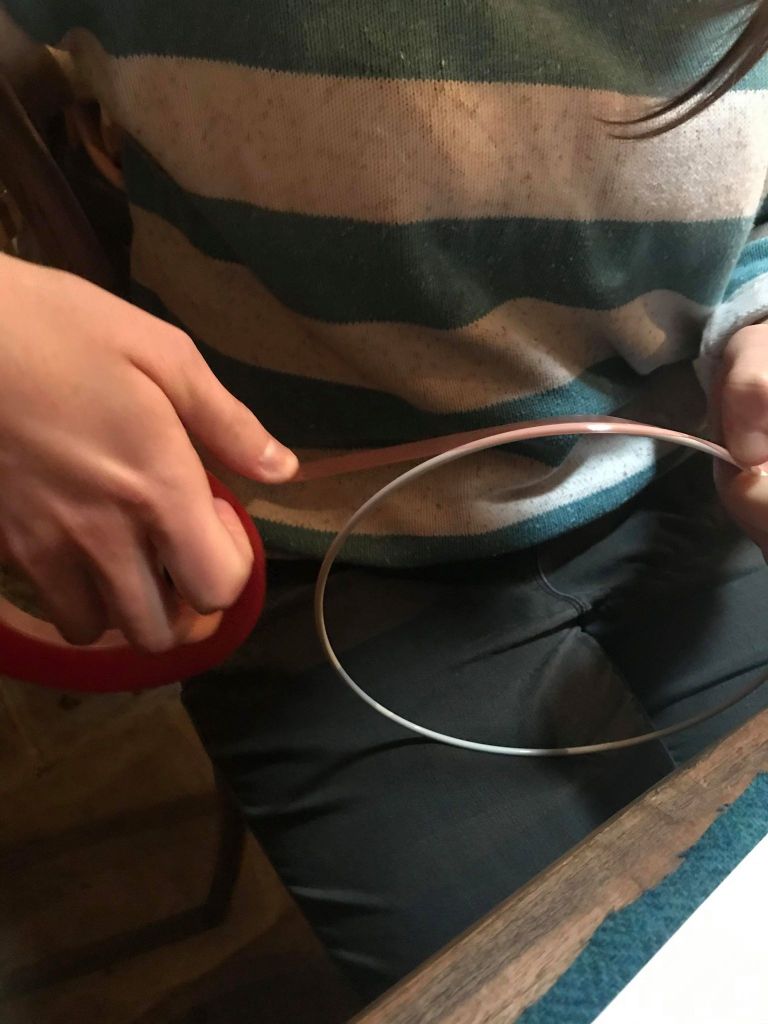 The next stage was to remove the tape baking and hold the top part of the lamp fitting in the left hand and the singular ring in the right hand and roll and stick it just on the edge of the lampshade plastic. We were insured to have the left hand ring with the bulb hole inwards. (See below). It was important to have it them in the correct hands cause it is hard to take a part if done incorrectly.