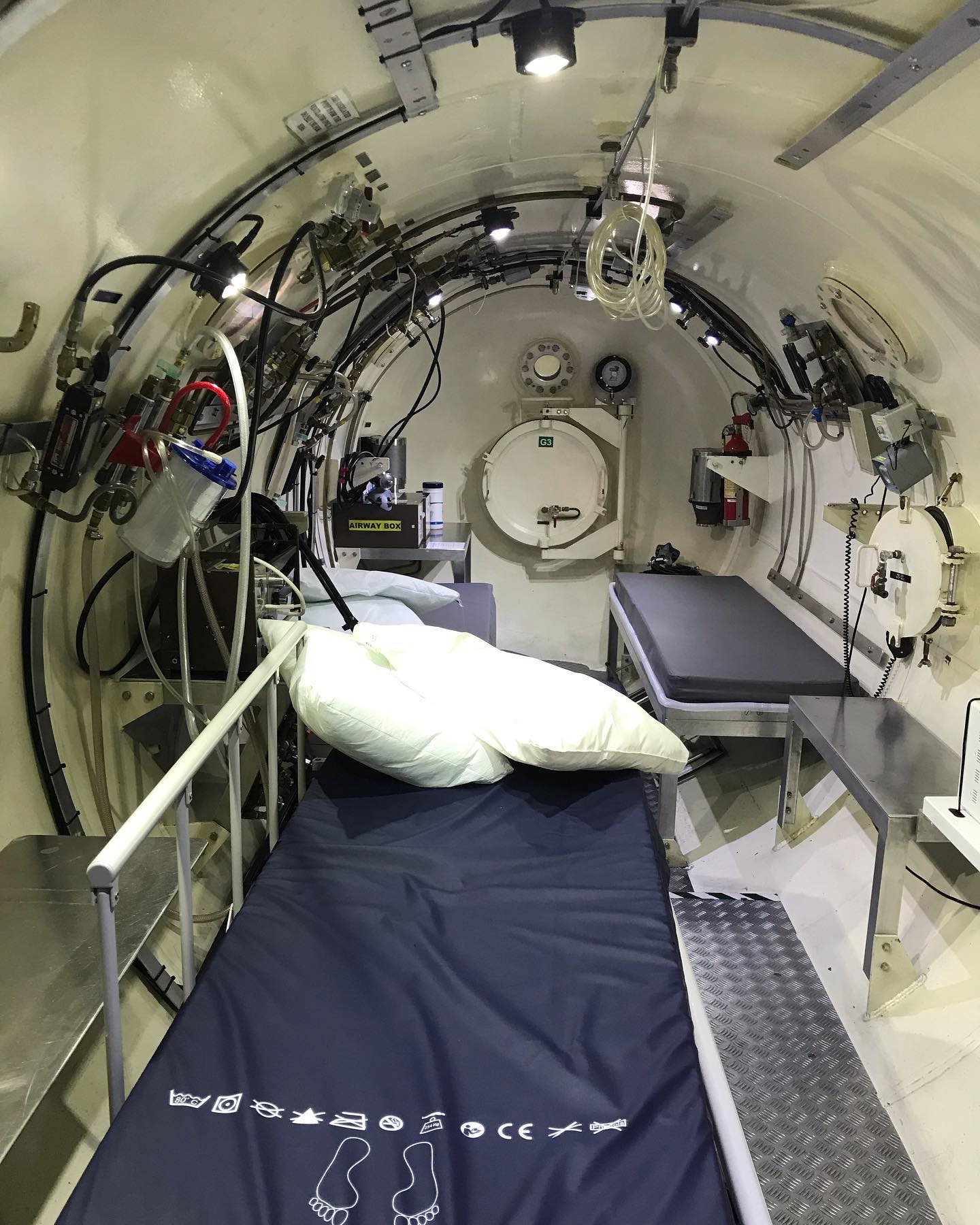 I was so surprised to learn that sometimes the person receiving the treatment and the nurses can be in the chamber from anything from a few hours to 4 days straight! There are beds and a bathroom type area. There is also a wee hole that can be used to pass food through.The chamber pressure is operated via the control room which you can see from the pictures below. It was incredible to visit! Thank you to Abbie Taylor who gave me the tour!