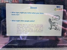 The session looked at what mental health and wellbeing meant to us, and gave us a chance to think about how we could recognises if we were stressed and/or if our colleagues were stressed. It gave as an opportunity to reflect on our own stress levels using the stress level bucket and how we could use that in the work place. It highlighted the impact of stress within the health care work setting and highlighted the 5 ways to wellbeing. It was a nice little session. Prior to the session we had the opportunity to answer questions about resilience to get us into the frame of mind for the session in the afternoon. I really liked this little session it has prepared us for life as a registrant!