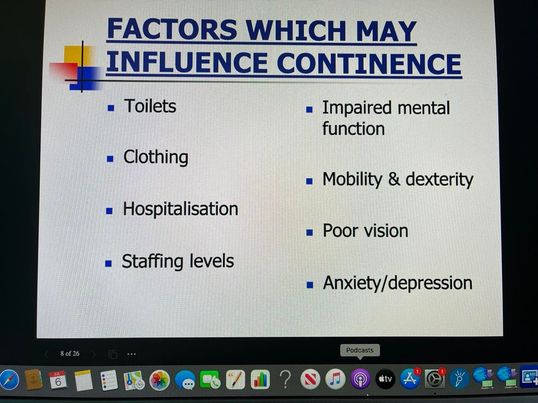 We had a session from the bowel and bladder specialist service which was excellent. I found this really interesting. They covered incontinence, causes of incontinence, they covered the physiology of the male and female urinary tract, types of incontinence, how the bowel and constipation can lead to incontinence, how to promote bowel health and ways to supporting people.